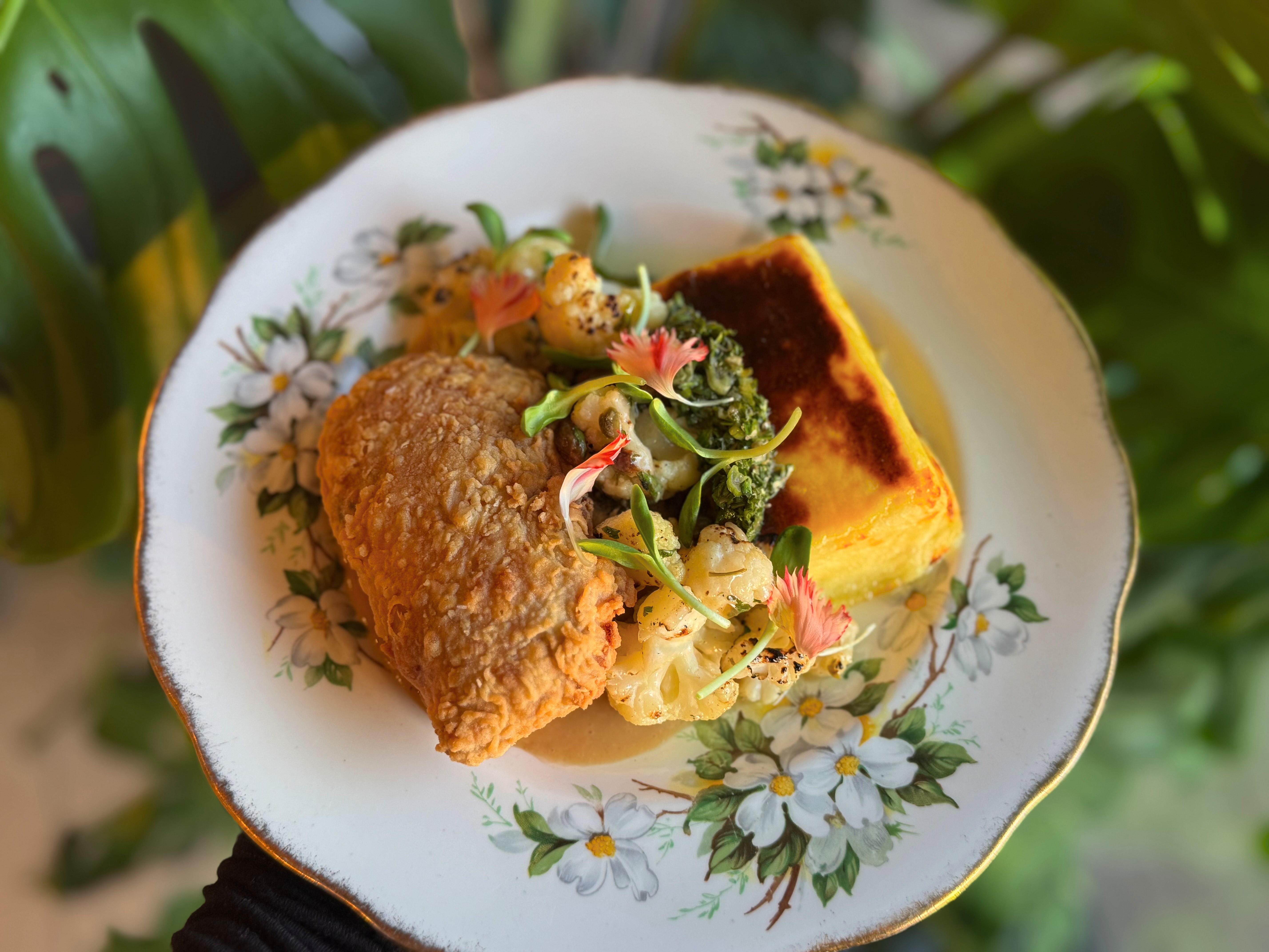 Crispy boneless stuffed chicken leg, semolina & parmesan dumpling, cauliflower, raisins, capers
