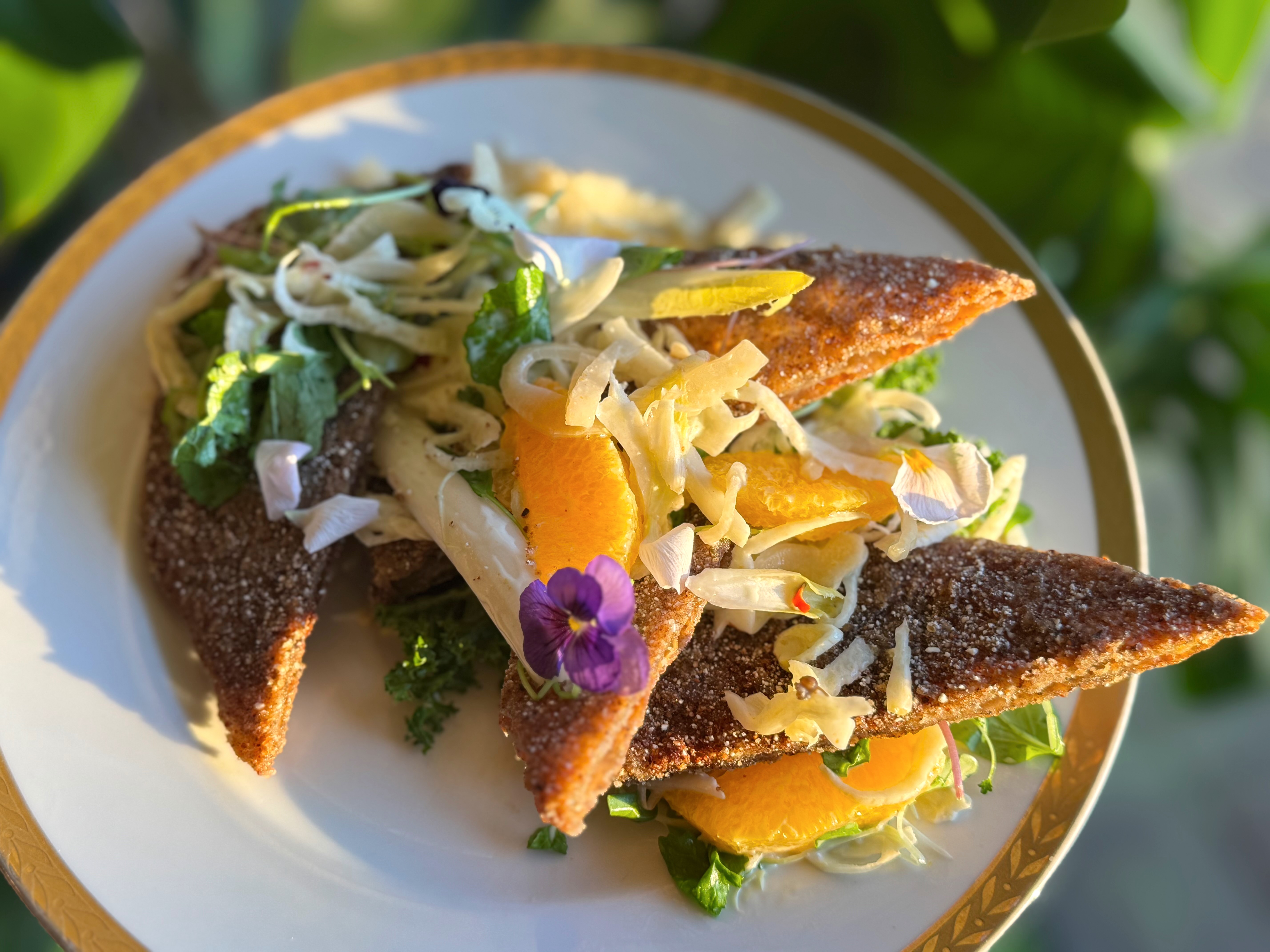 Crispy eggplant, endive, fennel, citrus, green, herbs, mustard & maple vinaigrette