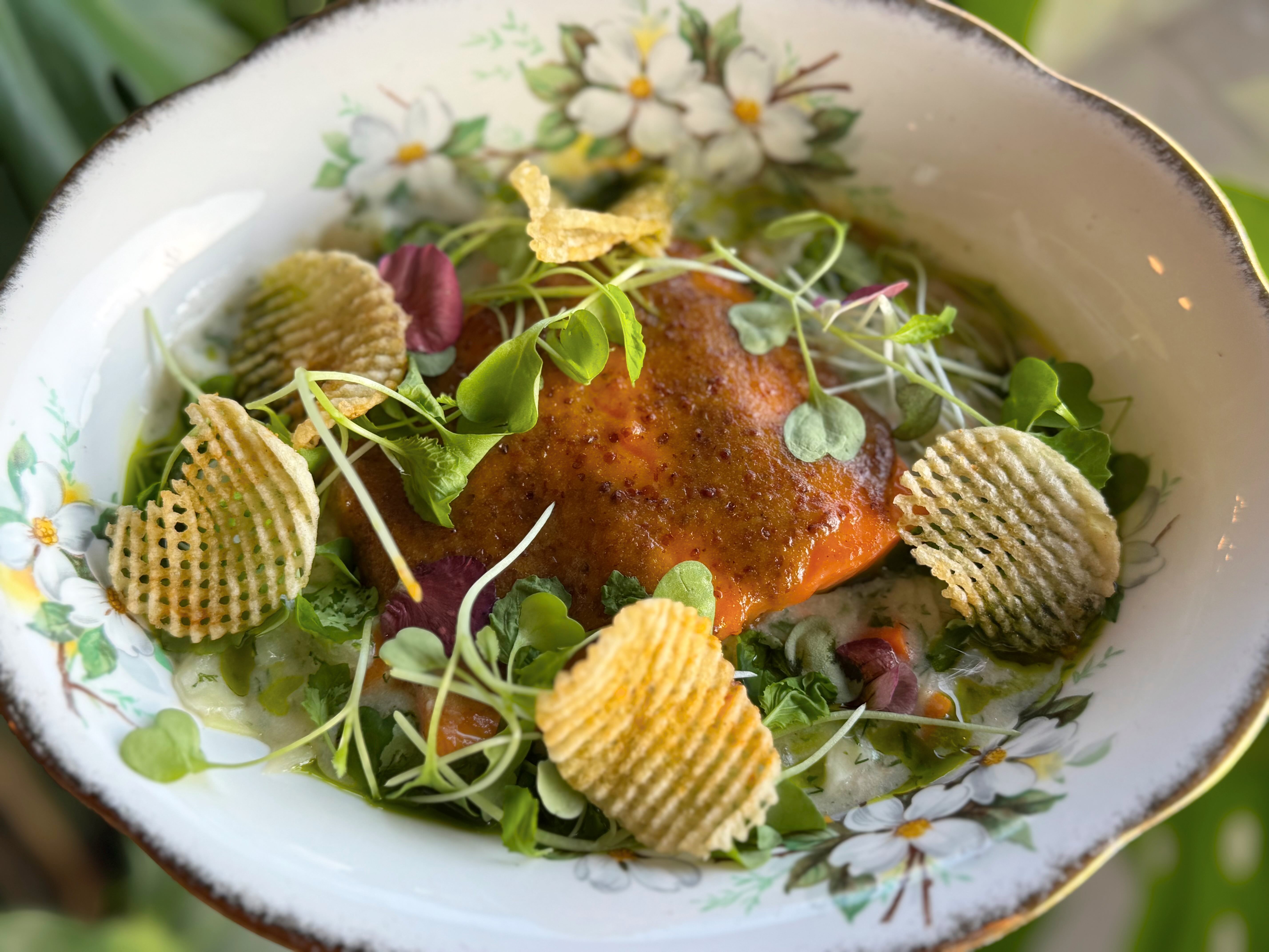 Mustard crusted trout on a smoked trout, potato, cabbage, soffritto, and preserved lemon chowder