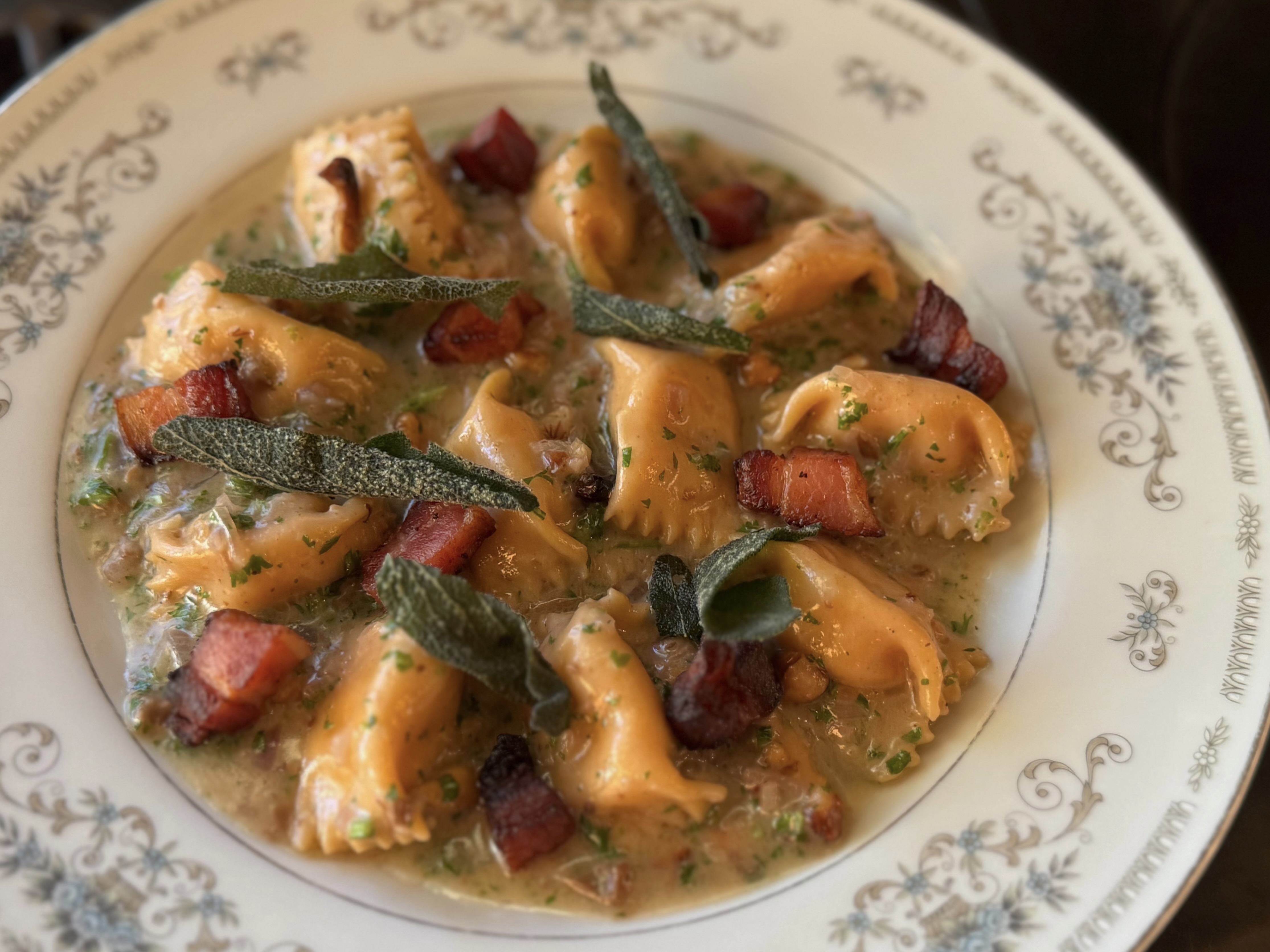 Squash & ricotta agnolotti, black garlic & walnut brown butter sauce, bacon, herbs, crispy sage