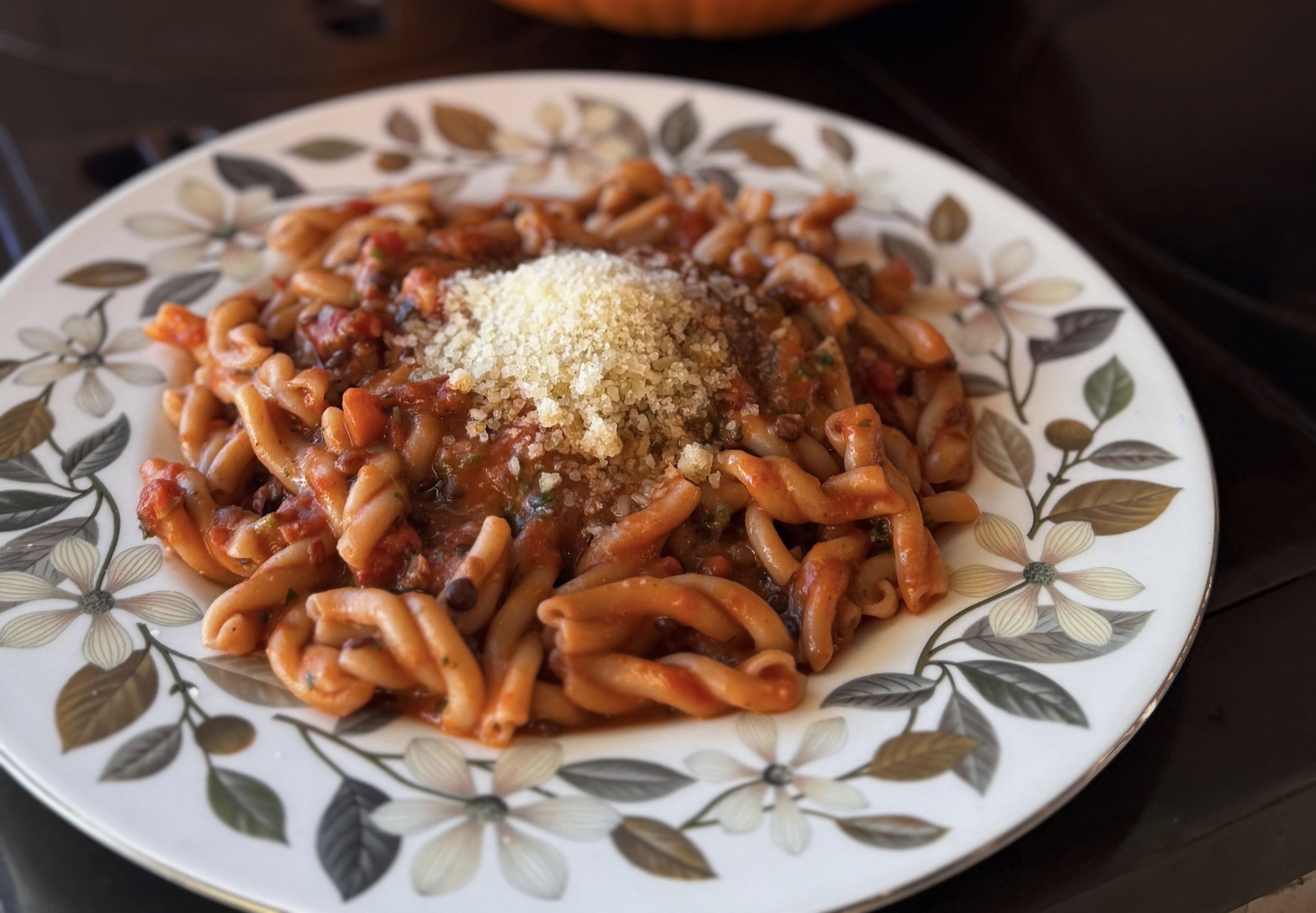 Casarecce pasta in rich mushroom and lentil bolognese sauce, parmesan