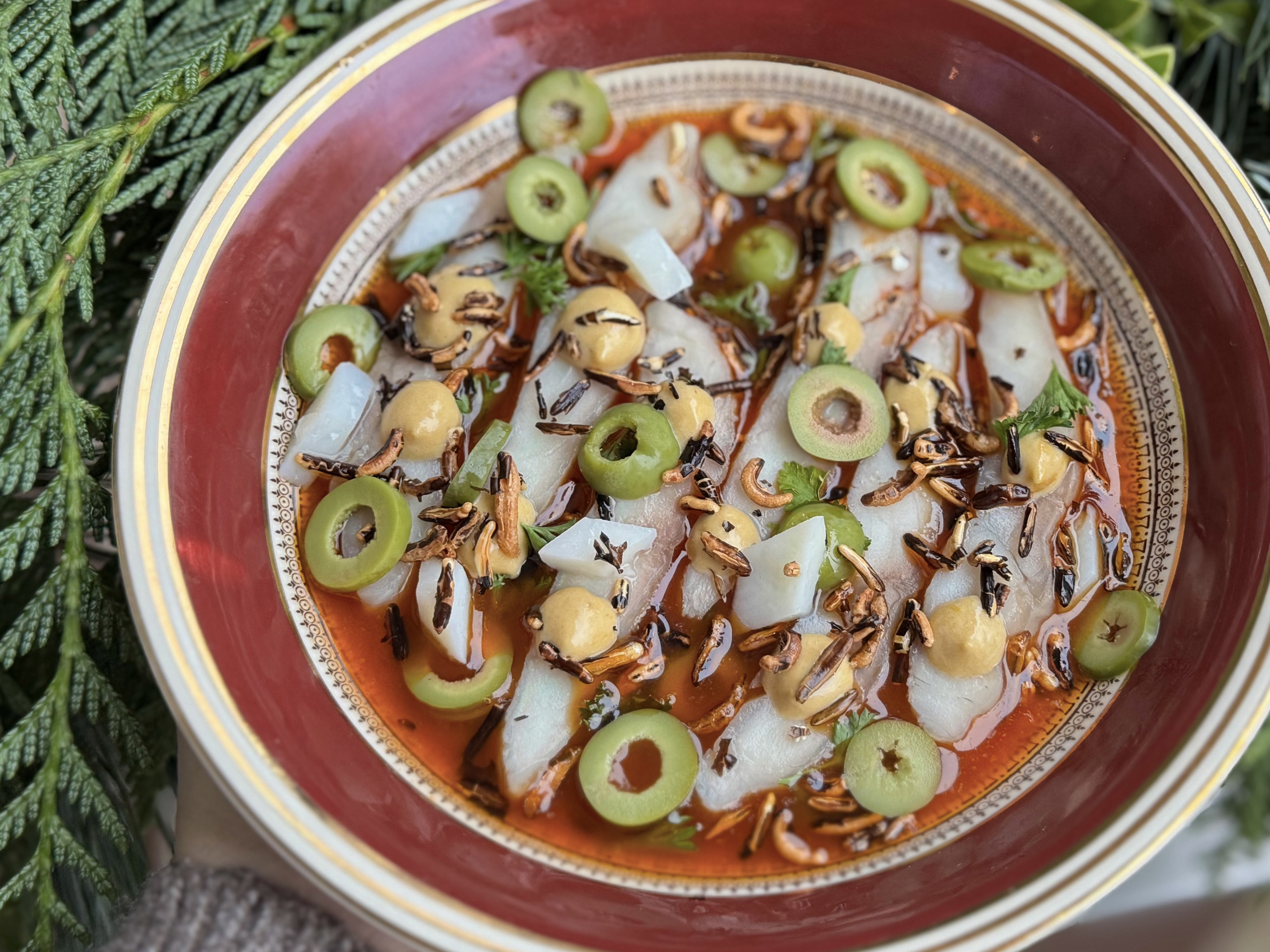 Lightly cooked pike, sauce escabeche, black garlic aioli, confit potato, olives