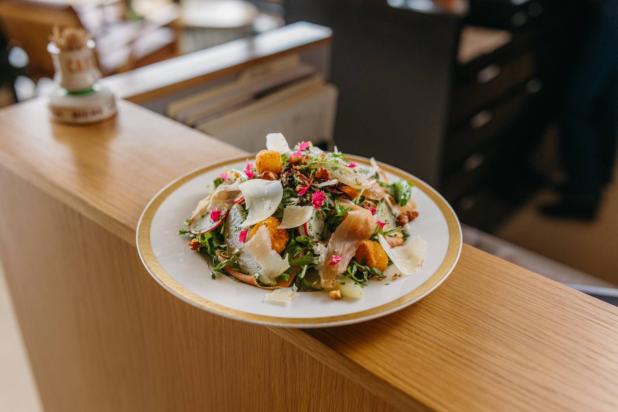 Pickled pear, prosciutto, radish, crispy brie, parmesan, candied walnuts, herbs, greens, white balsamic vinaigrette